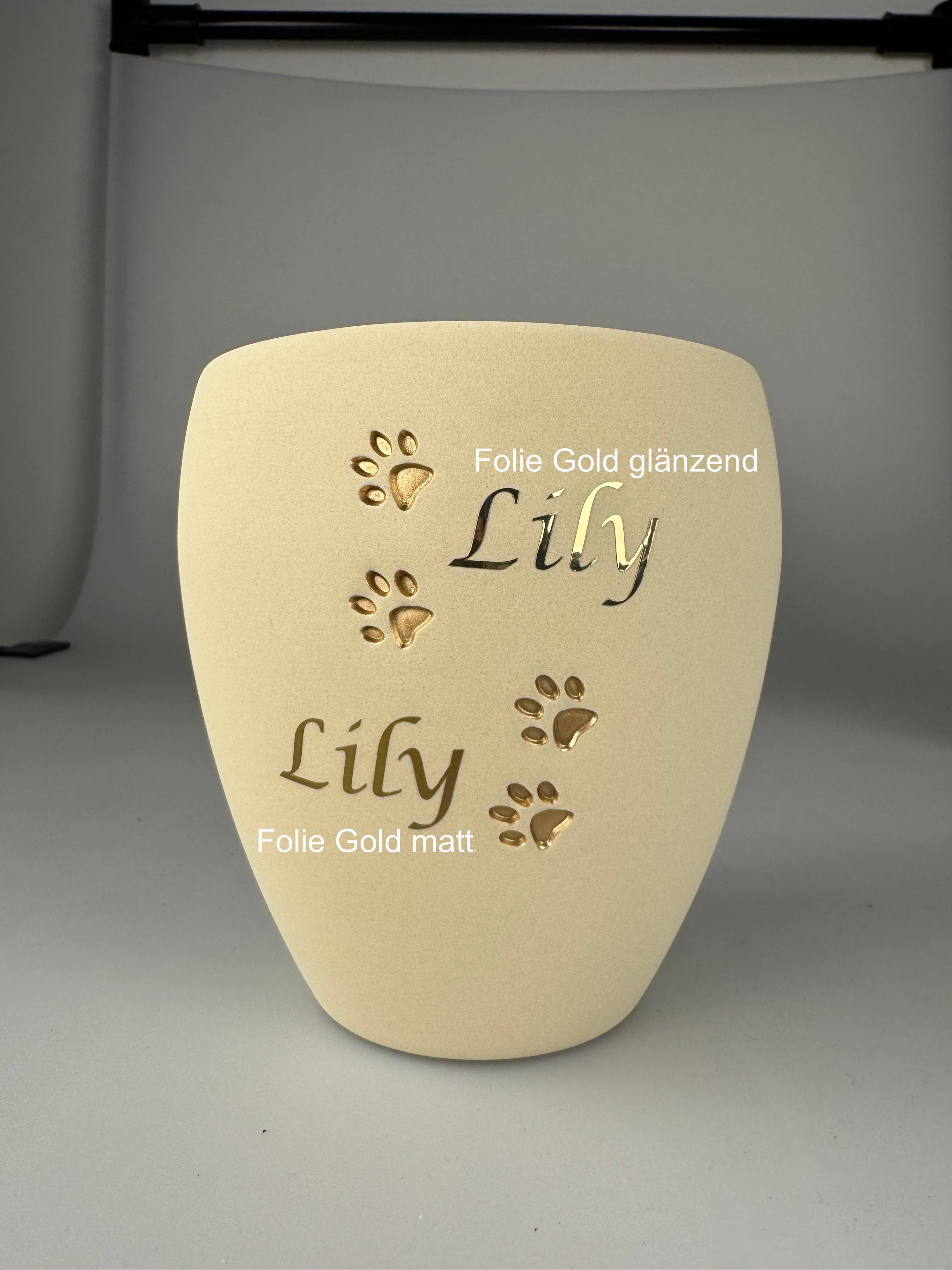 Ein besonderes Highlight sind die Personalisierungsmöglichkeiten, durch einen Namen oder eine persönliche Botschaft, machen Sie die Urne zu einem unverwechselbaren und unvergesslichen Andenken an Ihre(n) Katze oder Hund.