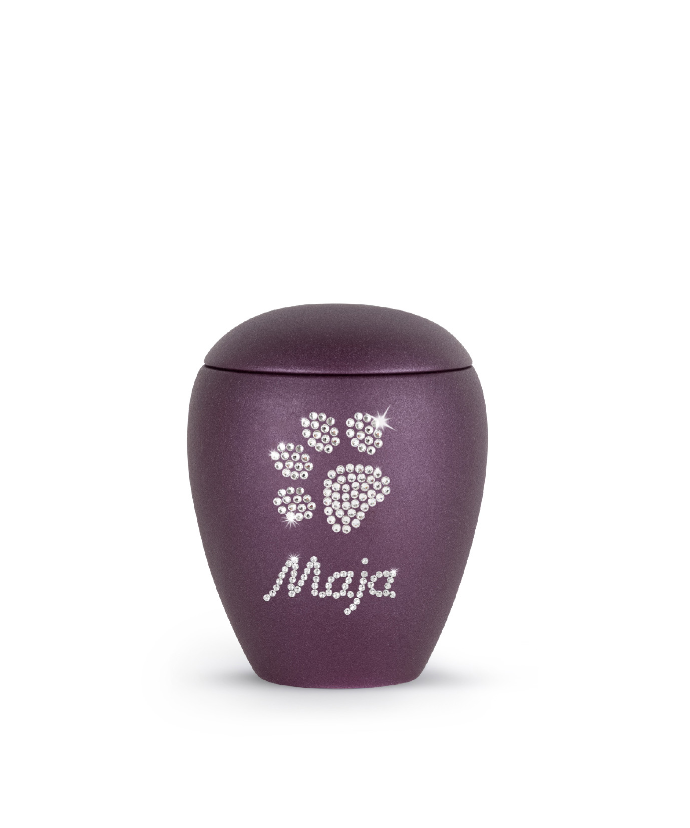Diese Beschriftung mit Swarovski-Kristallen können Sie für alle Tierurnen in unserem Sortiment auswählen.