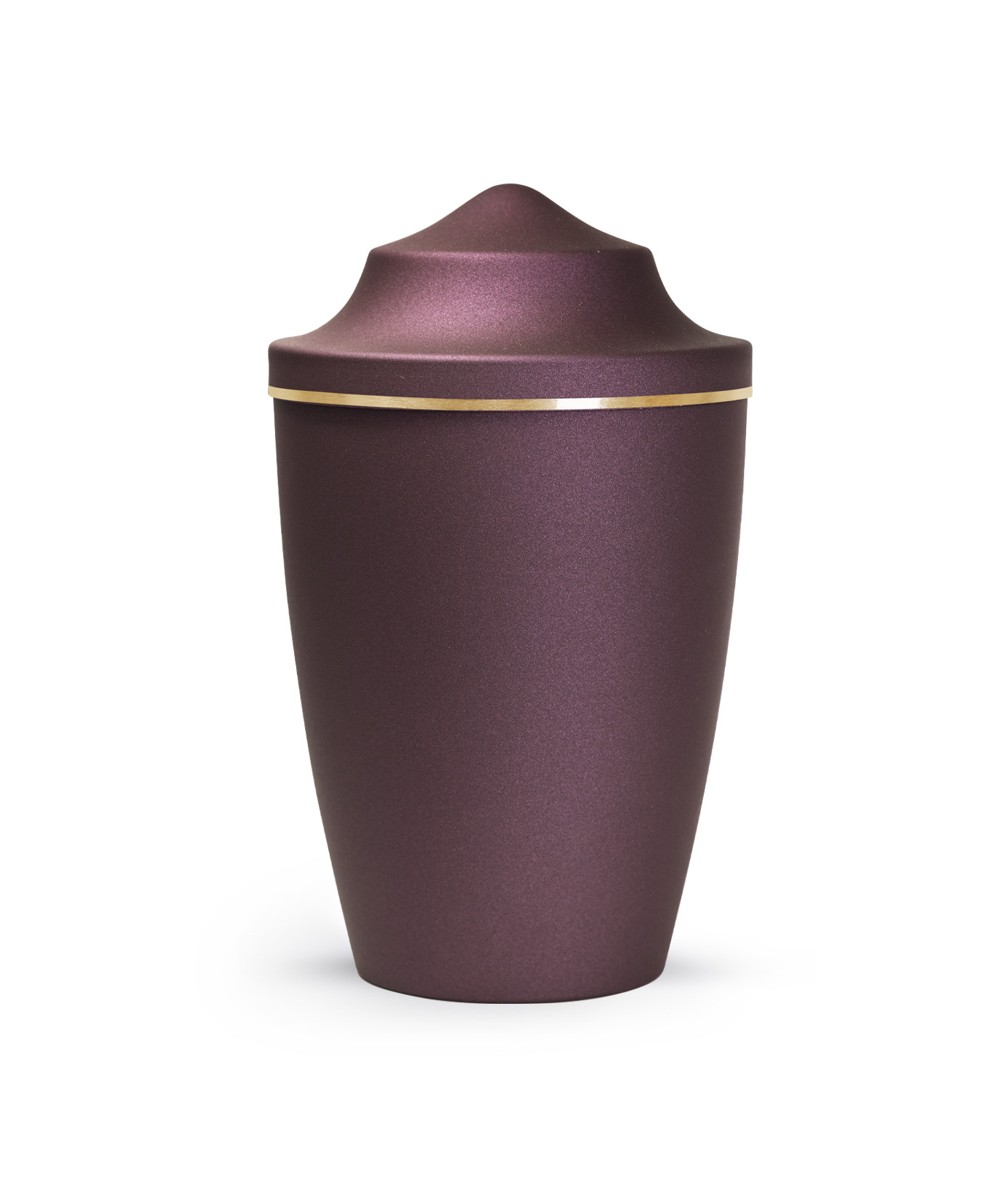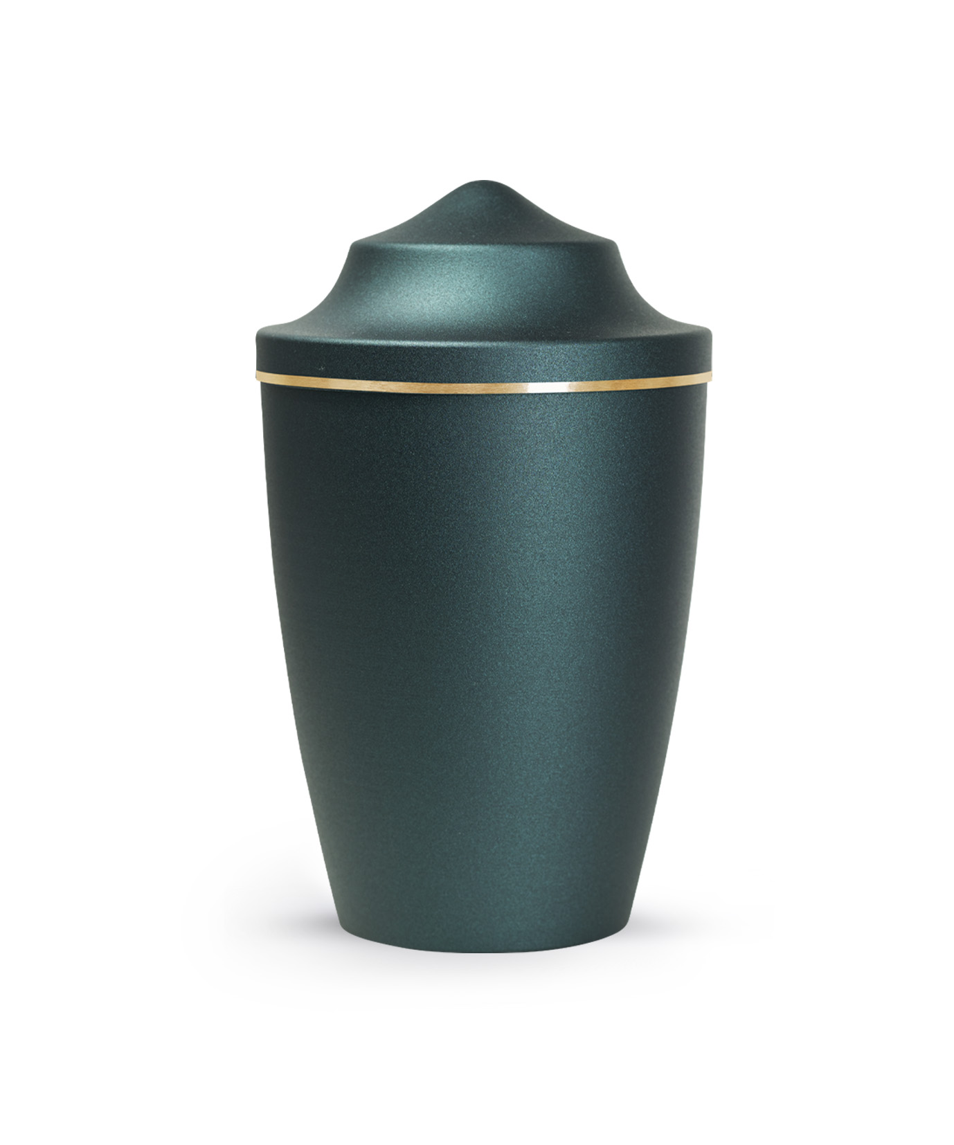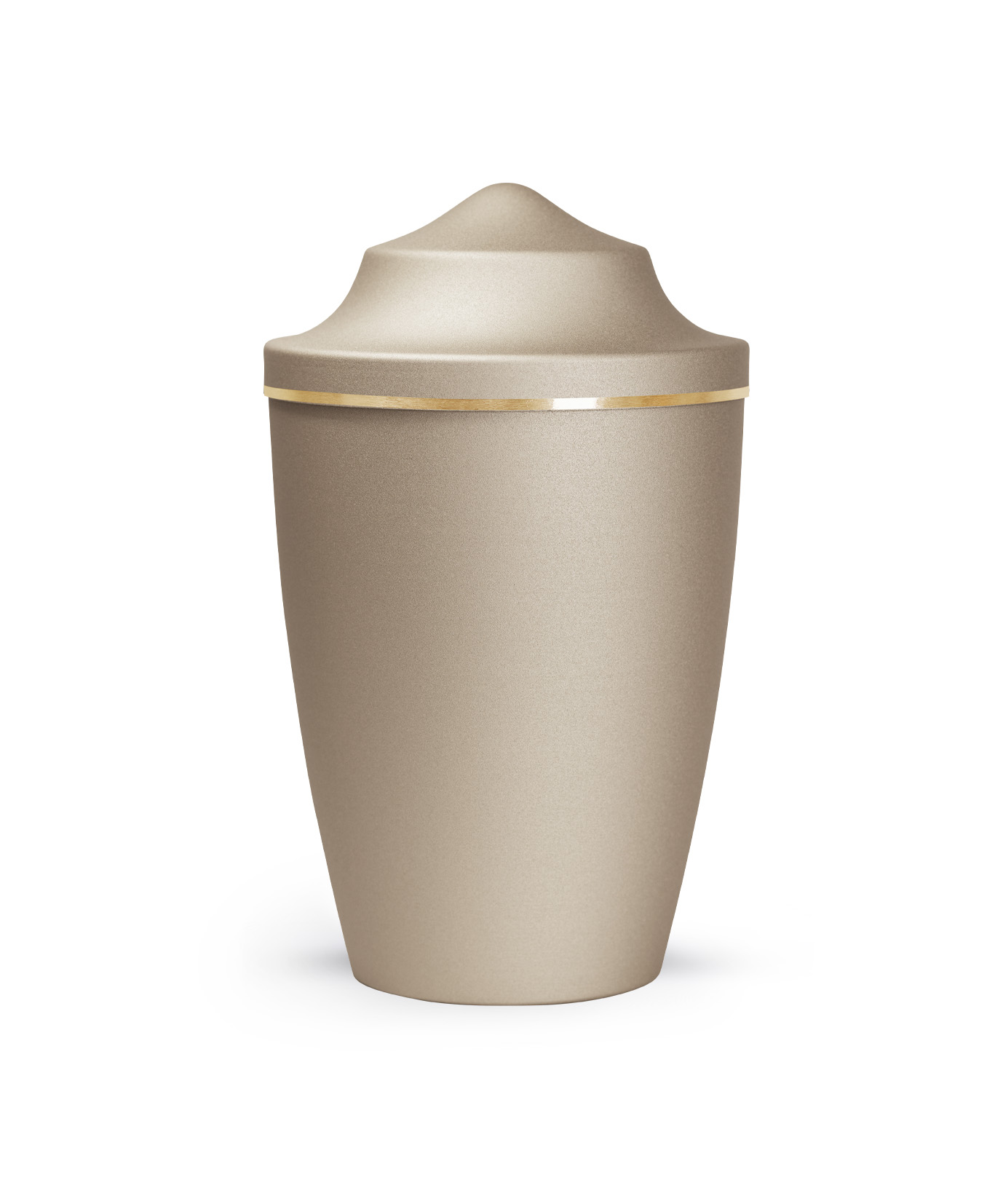 This metal urn has a glossy satin surface with a brushed gold band. The urn is available in the sizes 0.5 l, 1.5 l and 2.8 l and in 8 different colours. In addition, you can choose from 3 different lid designs to personalise your urn. The ashes are placed inside, with or without a plastic bag (not included).