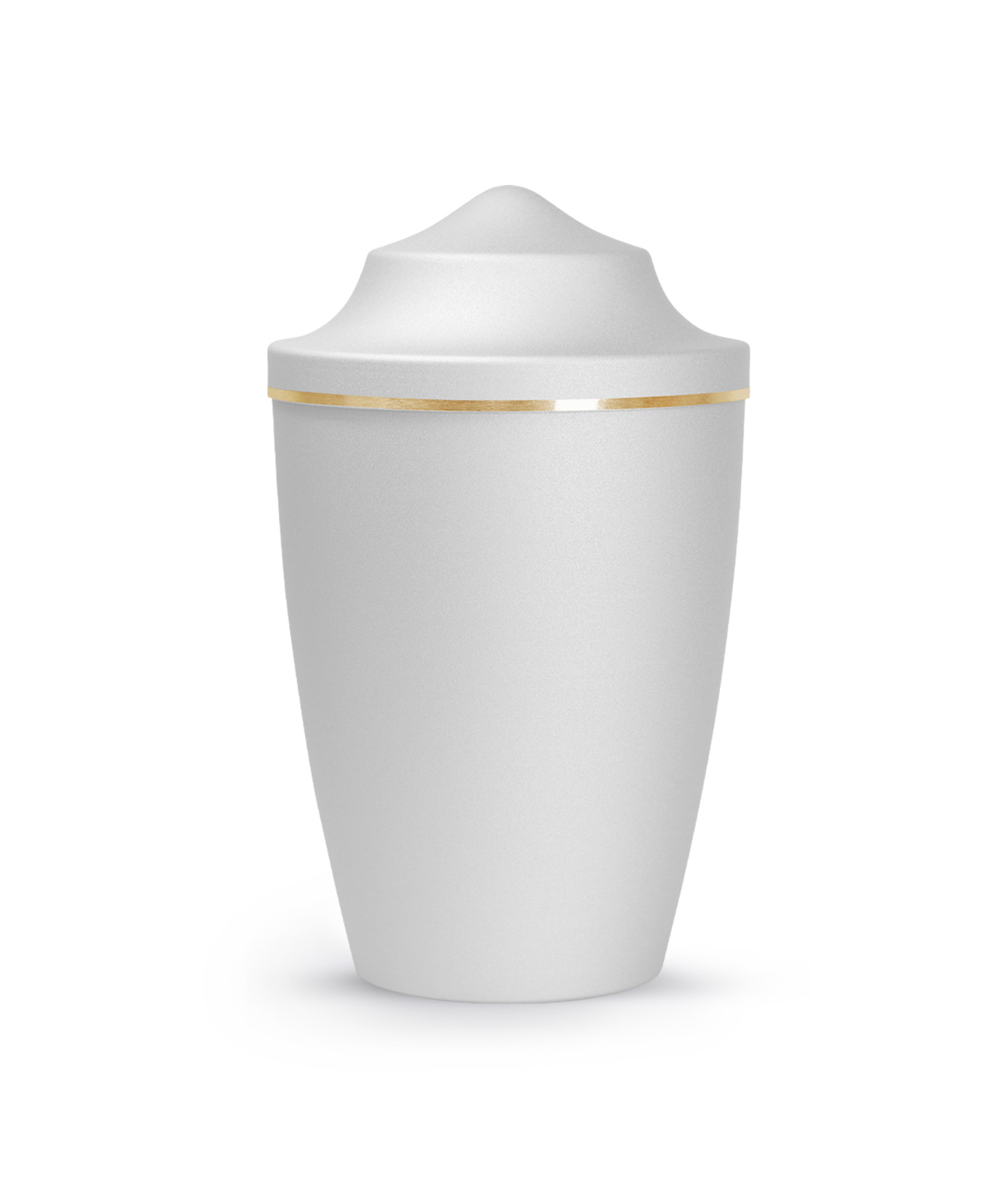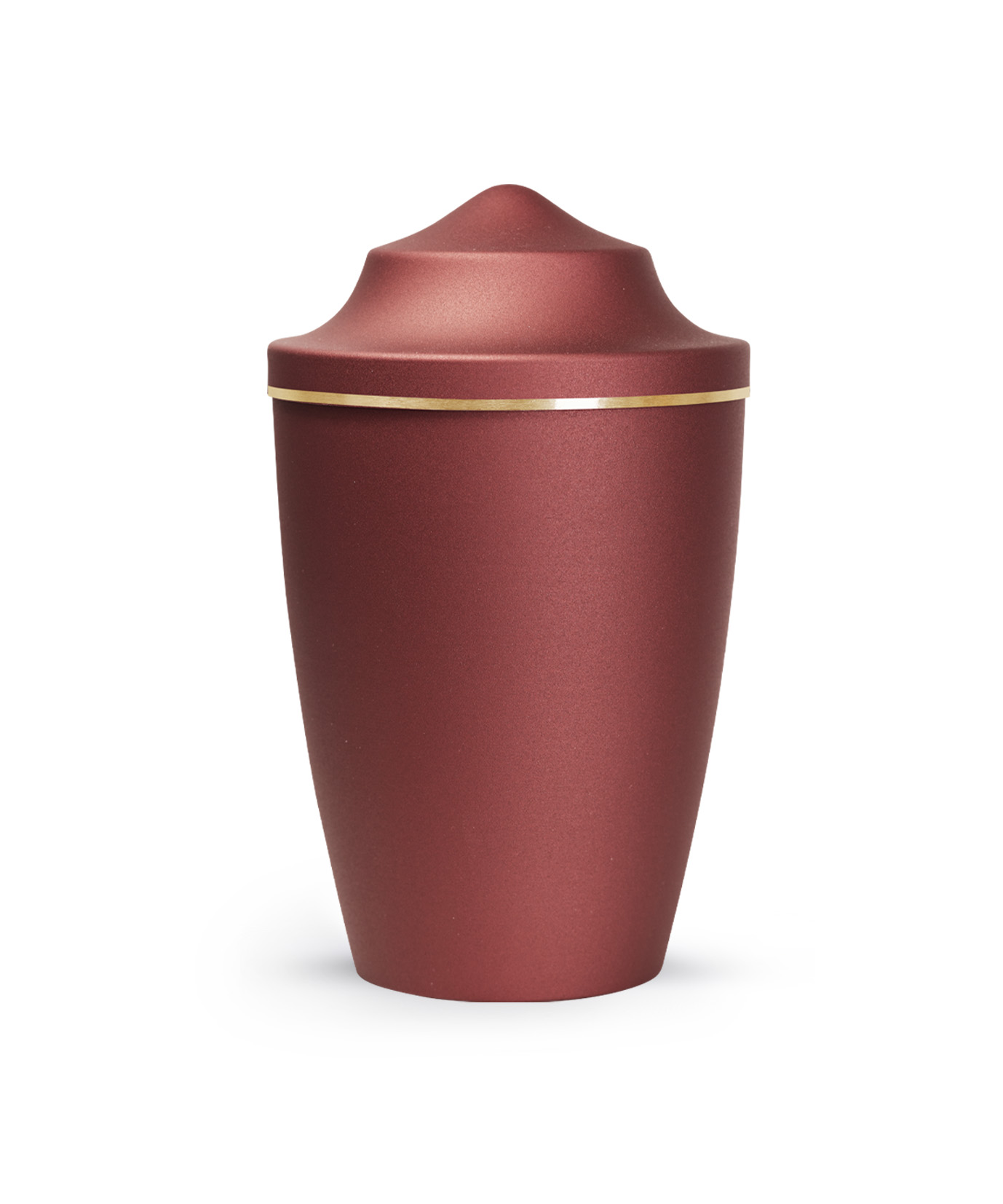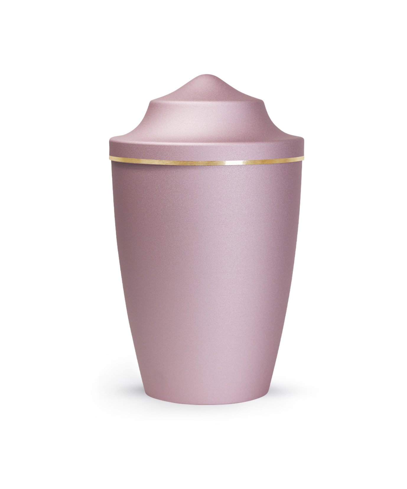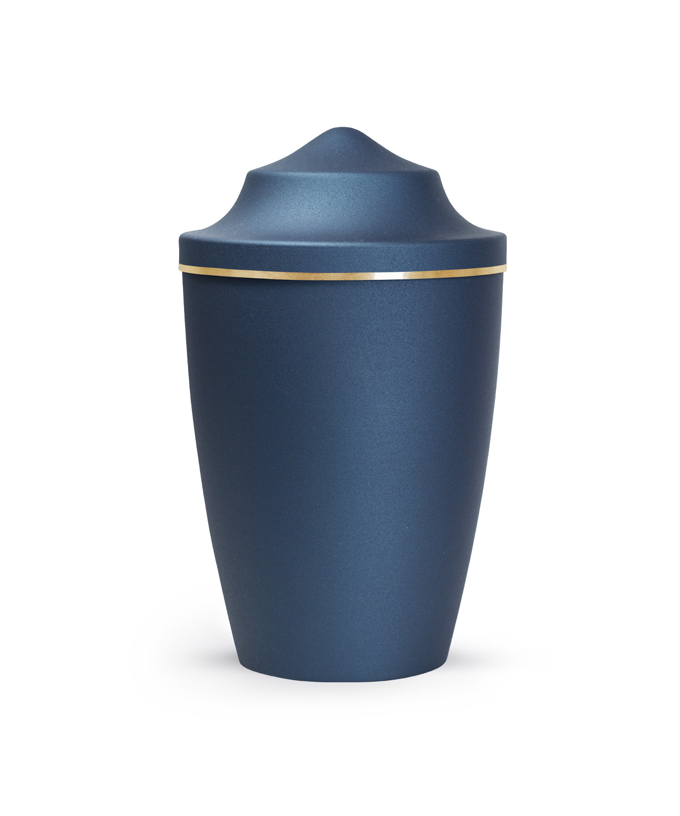 This metal urn has a glossy satin surface with a brushed gold band. The urn is available in the sizes 0.5 l, 1.5 l and 2.8 l and in 8 different colours. In addition, you can choose from 3 different lid designs to personalise your urn. The ashes are placed inside, with or without a plastic bag (not included).
