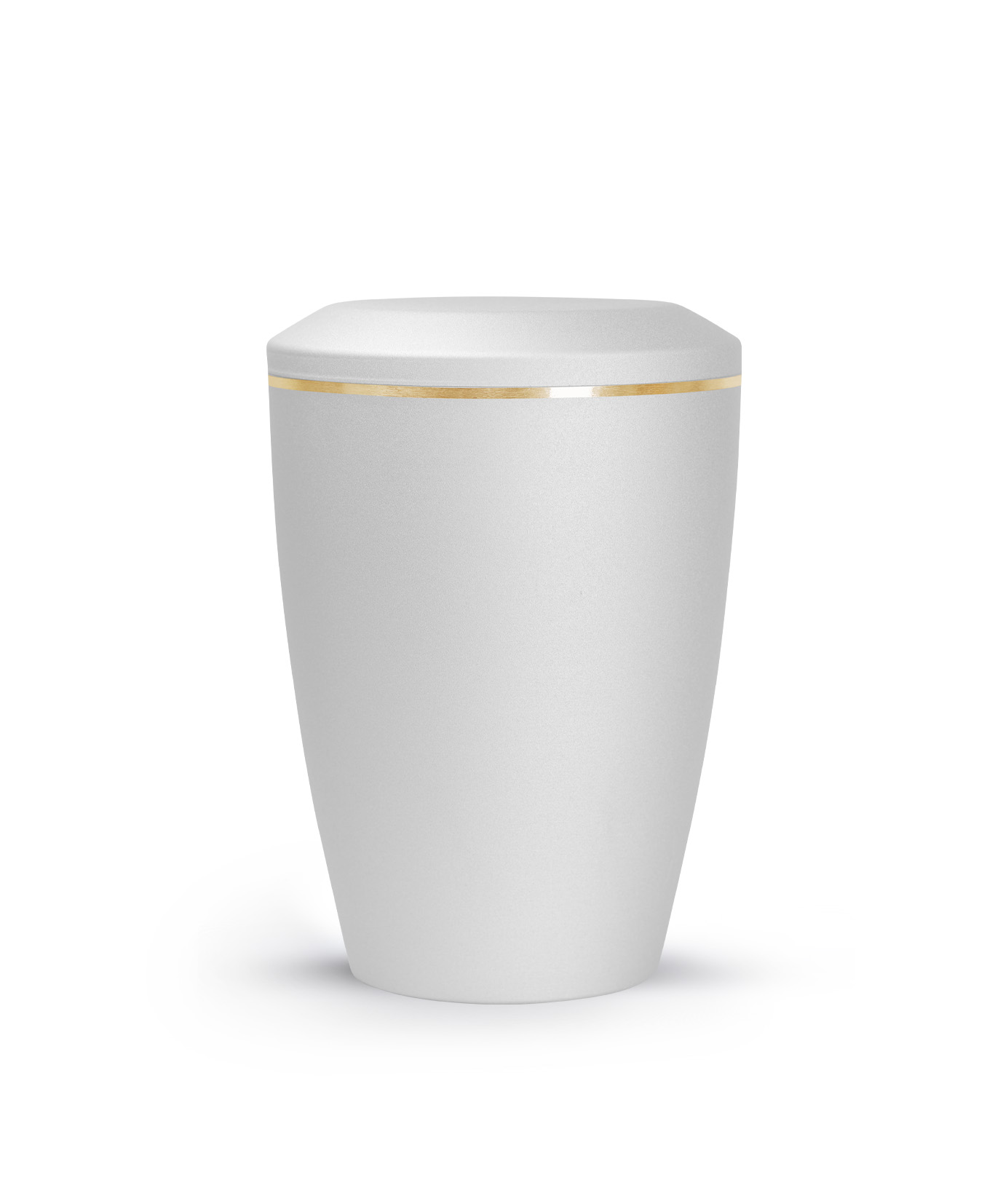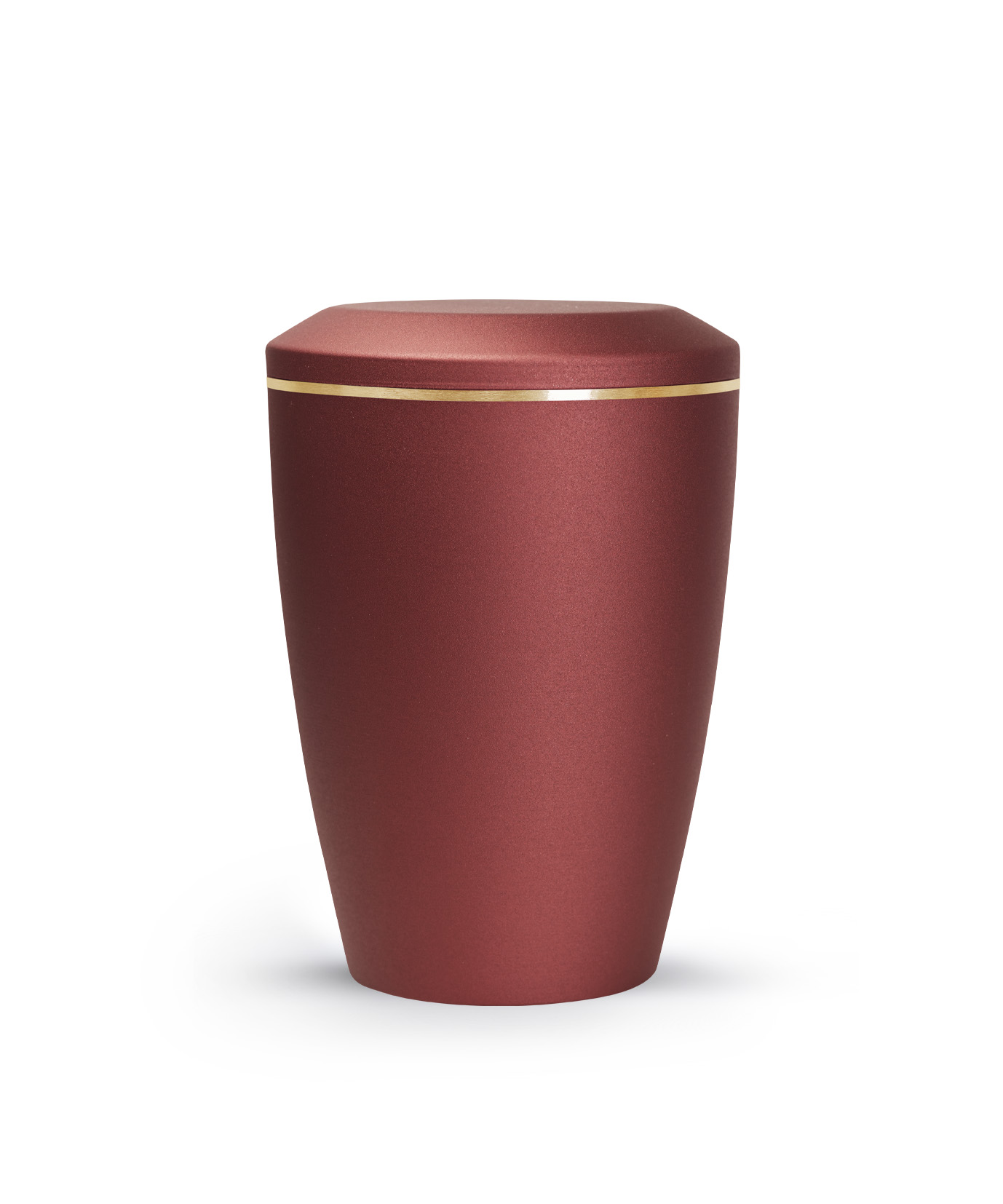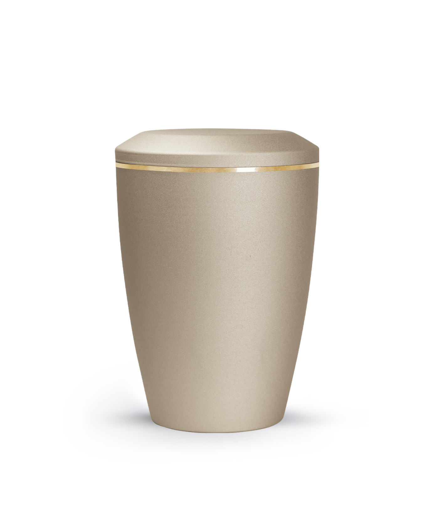 This metal urn has a glossy satin surface with a brushed gold band. The urn is available in the sizes 0.5 l, 1.5 l and 2.8 l and in 8 different colours. In addition, you can choose from 3 different lid designs to personalise your urn. The ashes are placed inside, with or without a plastic bag (not included).